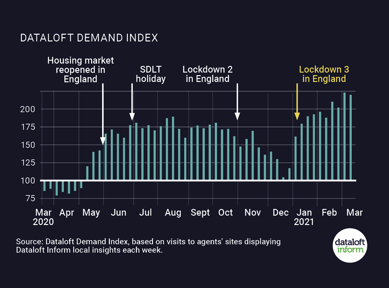 • But with lockdown restrictions starting to ease and incentives to move, all eyes will now look to whether new supply starts to increase. Source: Dataloft Demand Index, based on visits to agents’ sites displaying Dataloft Inform local insights each week.